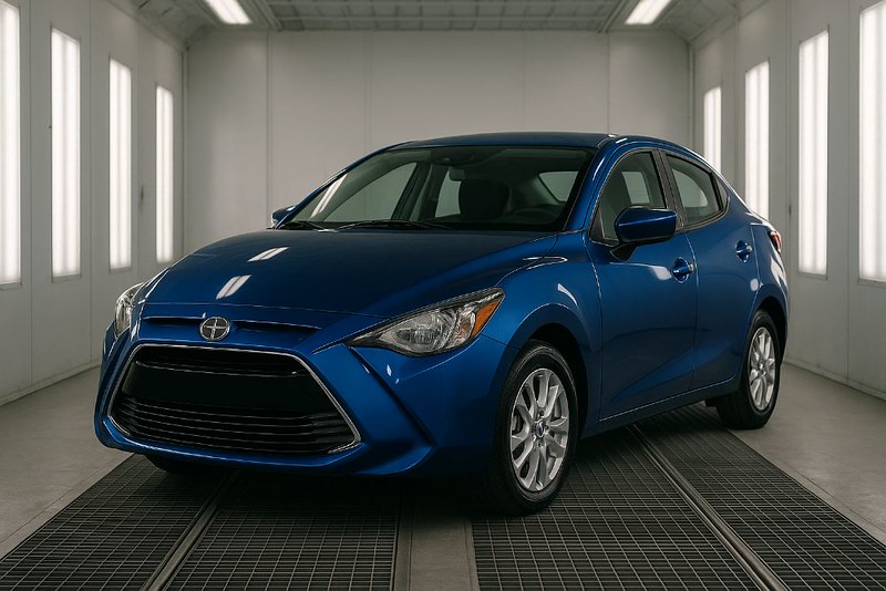 Blue scion in paint booth at Auto Stiegler Reseda CA